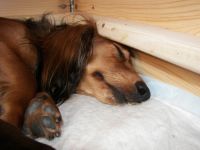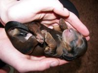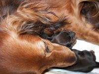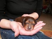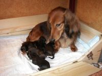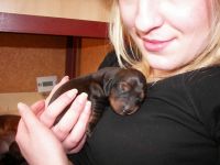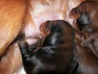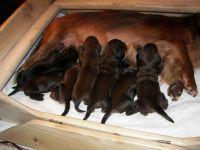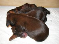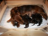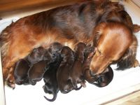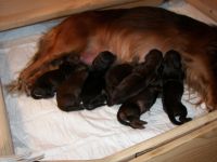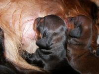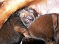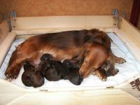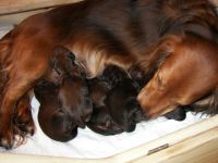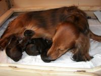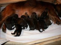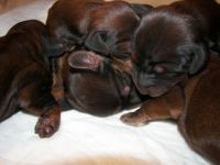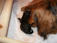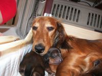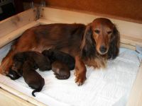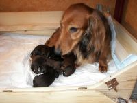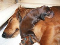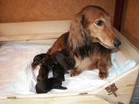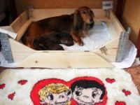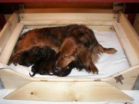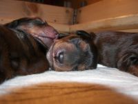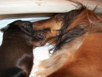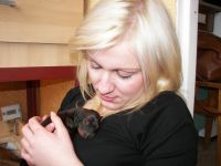 Dziś miałyśmy drugiego gościa, no tak nie wspomniałyśmy o pierwszym, to Jacek, kolega Karolinki. Była u nas Madzia, mamusia tak jak Jacka przywitała ją wylewnie i aż ją duma rozpierała jak nas pokazywała. Pozwalała nas brać, tulić i głaskać. Podobno kolejka chętnych do przywitania z nami jest baaardzo długa ale będą musieli poczekać. No tak, ale kto widział poza wystawą, jamniki długowłose standardowe a takie szczenięta jak my to poza rodziną nikt. Rośniemy jak na drożdżach a Państwo oczy przecierają ze zdumienia bo żaden jamnik tyle zjeść nie może. Pan to nawet wagę sprawdzał czy nie zepsuta. Państwo nas rozpoznają kto jest kto, choć nie jest to proste, ale na wszelki wypadek Karolinka spisała wszystko co nas odróżnia. Pani choć jesteśmy przy Niej cały czas, uwielbia oglądać na stronie zdjęcia nas i naszego starszego już dorosłego rodzeństwa. Tym razem na coś narzekała a Pan się śmiał żeby się ustawiła w kolejce bo ogląda nas tyle osób że niedługo serwer padnie z przeciążenia.