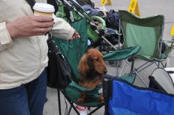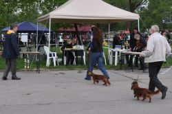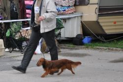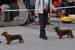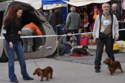 Droga na wystawę była daleka a i pogoda kiepska, na drodze była mgła ale taka inna zrobiona z pyłu wody od opon pędzących samochodów, ale 200 km w dwie godziny to chyba da się przeżyć. Na wystawie super, było jeszcze lepiej jak na poprzedniej, same jamniki i to na 2 ringach. Na naszym zaczęły jamniki długowłose standardowe, tak że nie wynudziłam się przed wejściem.