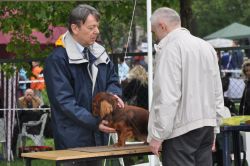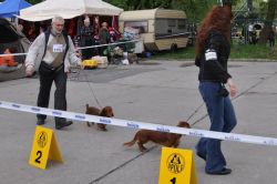 Chwila moment i już byłam na ringu razem z FRIDĄ Pani Dagmary. Oczywiście standardowo chodziłam a potem ładnie i grzecznie stałam najpierw na stoliczku gdzie Pan sędzia mnie wyoglądał a potem prezentowałam się na podłożu i jak zawsze ani drgnęłam, no może poza delikatnie głową, ale tyle ciekawych rzeczy wokół. Potem znów chodziłyśmy razem i Pan sędzia znów nas oglądał. Dostałam tradycyjnie ocenę doskonałą, a to najważniejsze, a zgodnie z przewidywaniami Pana zajęłam zaszczytne drugie miejsce he, he, he. Dostałam też mój trzeci w życiu, a drugi srebrny medal. Pan myślał że był jakiś poważny powód ( ja też się przestraszyłam że nagle okazało się że nie mam nogi) ale jak spojrzał w domu ( na wystawie nie pomyślał a i czasu nie było) do opisu to mu ulżyło bo w opisie miałam „piękna głowa i zgryz, dobra górna linia, mało dynamiczny ruch, doskonały gatunek szaty, dobry temperament” No i wszystko jasne!!!, ale to Pana wina bo zamiast iść szybciej i mnie ciągnąć za sobą to mi dał luzik i sama szłam na niemal luźnej ringówce, he, he, he. No cóż Pan sędzia widać lubi szybszy ruch. A ja potrafię szybko i pięknie płynąć, jak idziemy bardzo szybko za Panem to ja jeszcze idę a mamusia już biegnie, ale Pan nie znał preferencji sędziego.